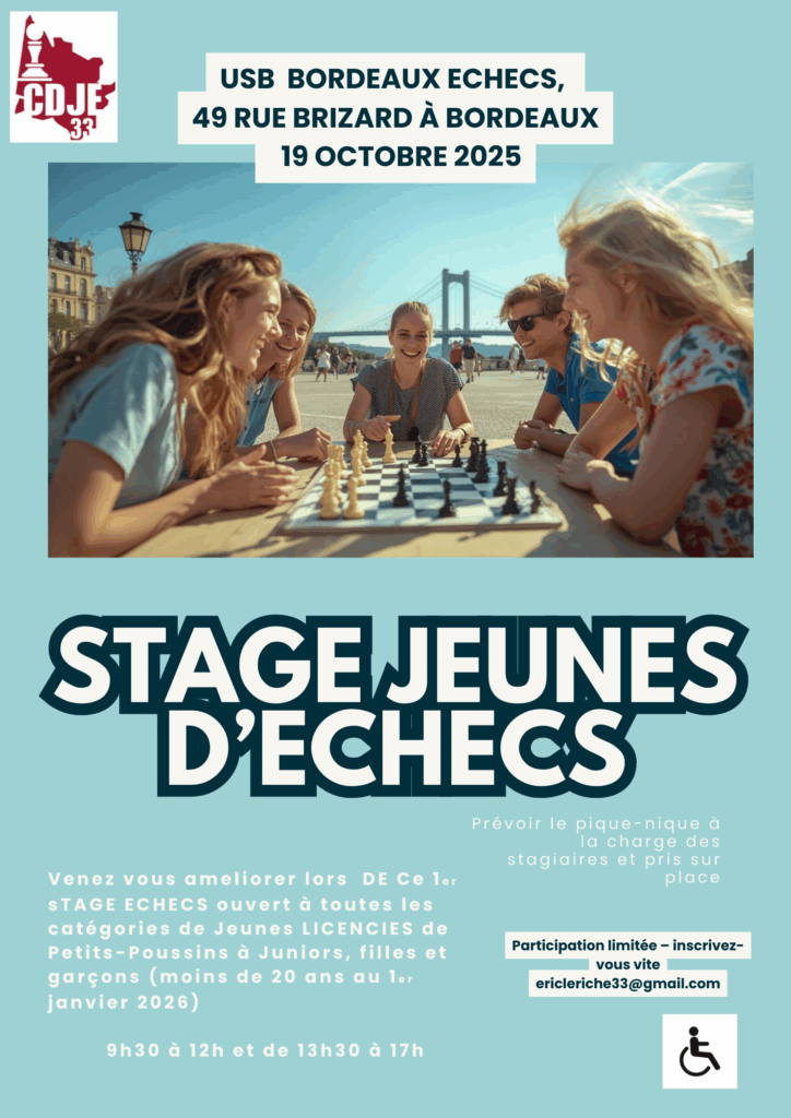 Nous avons le plaisir de vous annoncer la tenue du 1er Stage Départemental Jeunes du CDJE 33 de la saison 2025-2026 le dimanche 19 octobre 2025 (1er dimanche des vacances de la Toussaint).