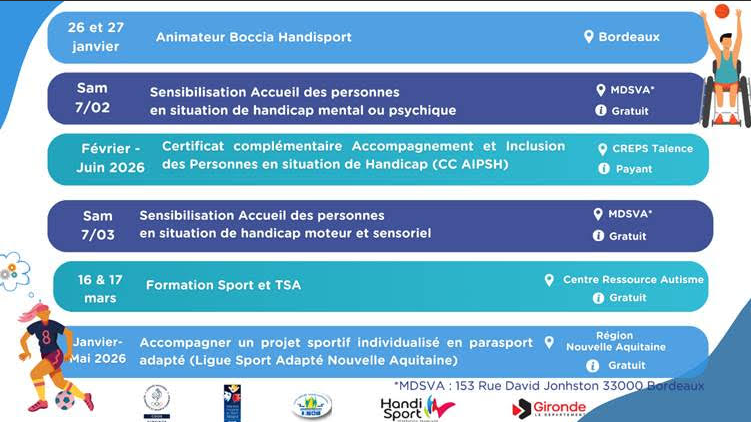 Veuillez trouver ci-joint une liste des sensibilisations et formations sur la saison 2025/2026 autour de l’accueil des personnes en situation de handicap. Ces temps se déroulent principalement en Gironde excepté celle de la Ligue Sport Adapté Nouvelle Aquitaine qui a quelques dates en Gironde ainsi que d’autres sur la région.